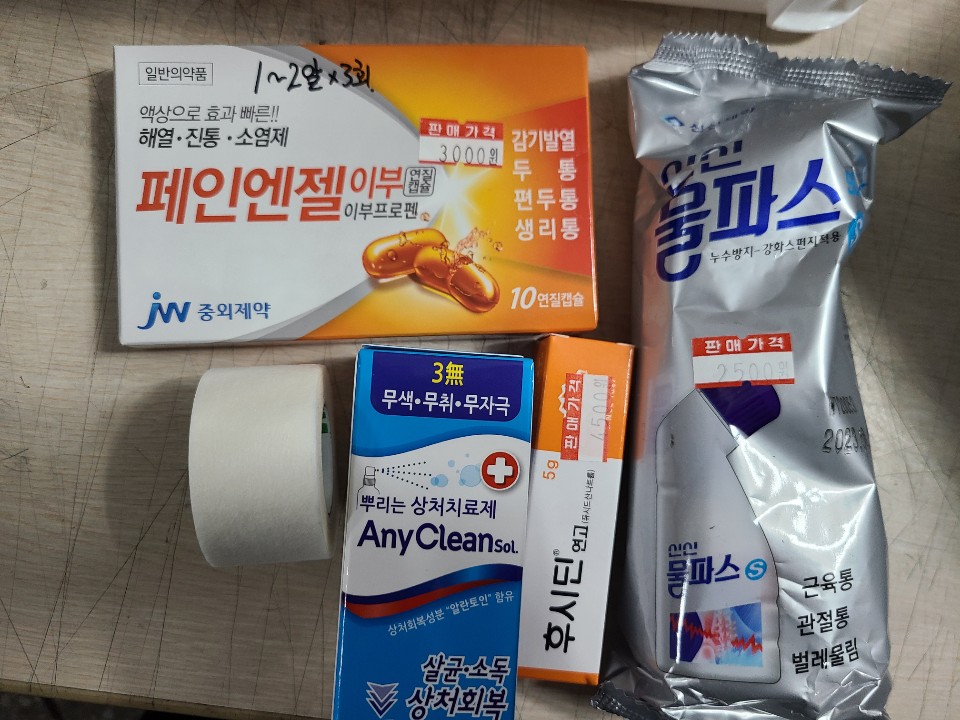 파스, 목소염제, 화상연고, 속쓰림약, 거즈, 알콜스왑 등등