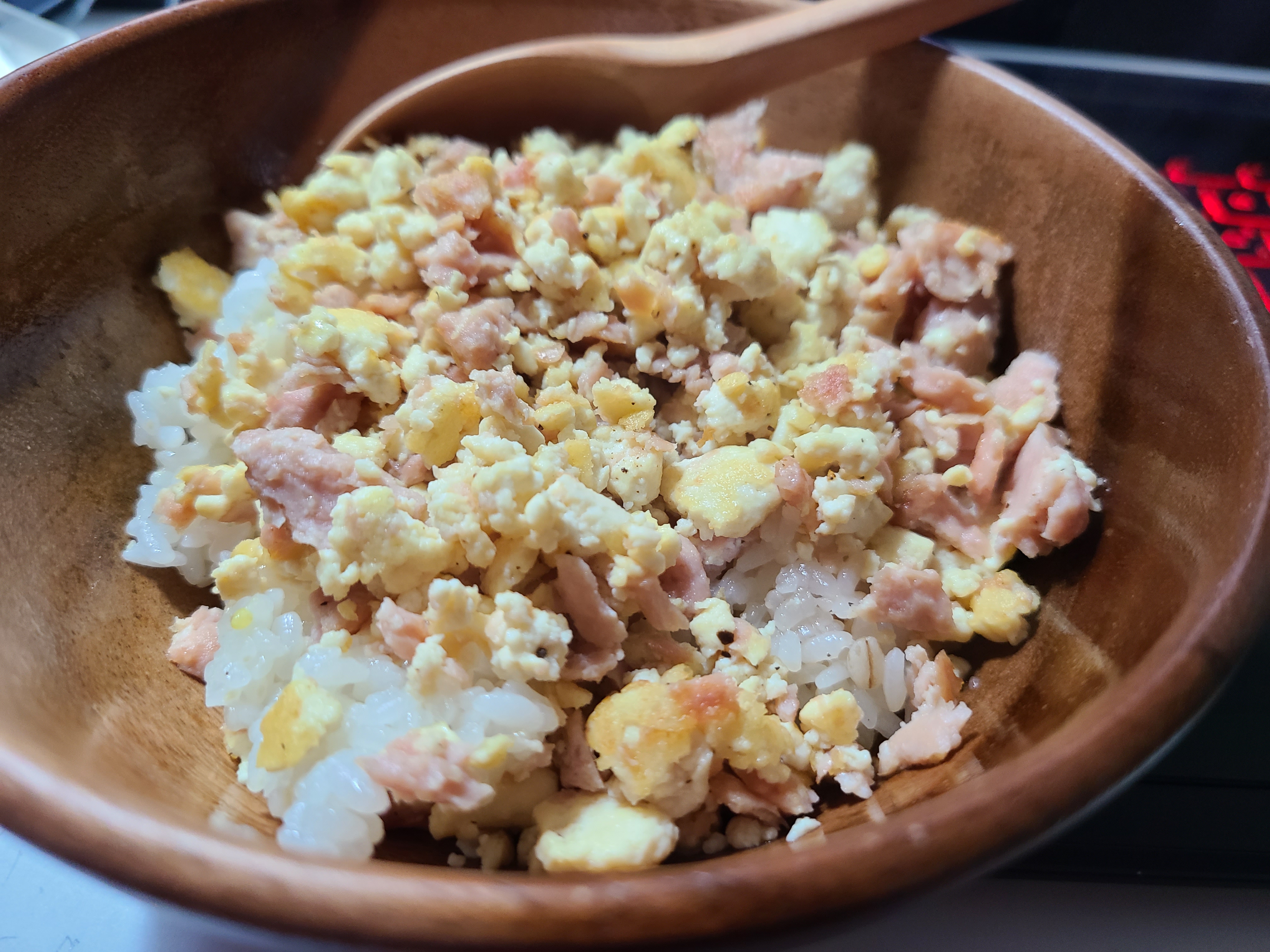 스팸도 손으로 으깨서 같이 올려 볶는다.
