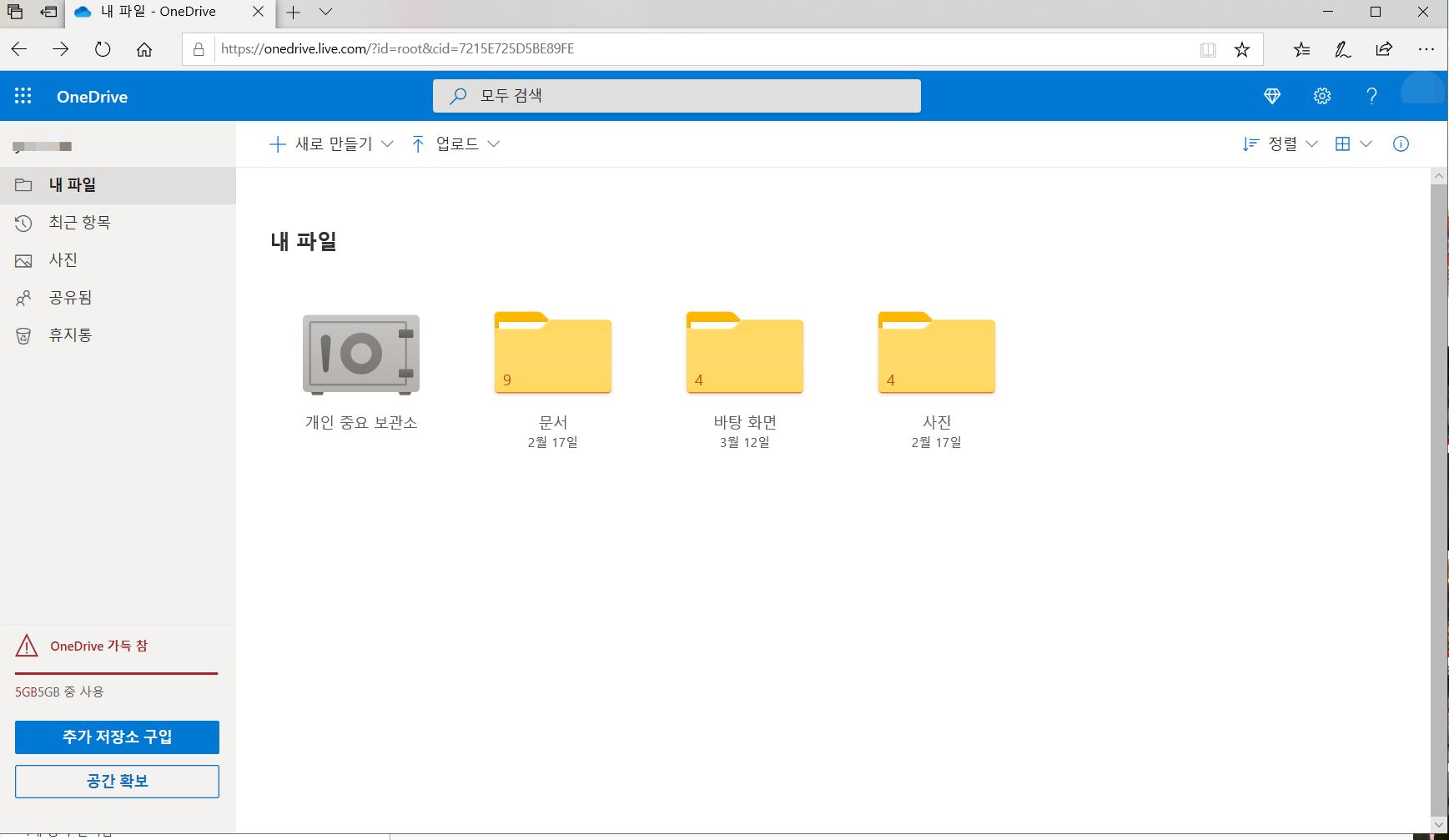 원드라이브 파일에 들어가보니 사용할수 있는 용량이 5기가인데 꽉차서 x표시가 떠있는 것이다.
