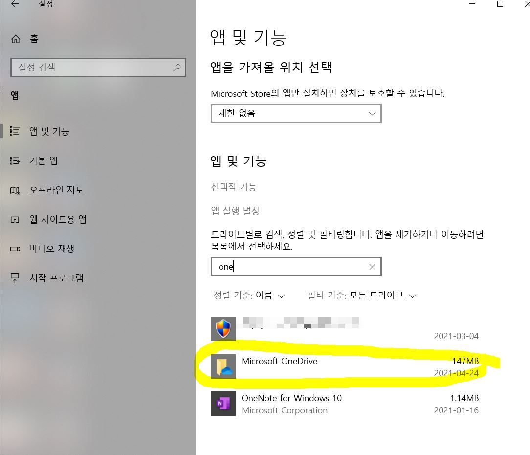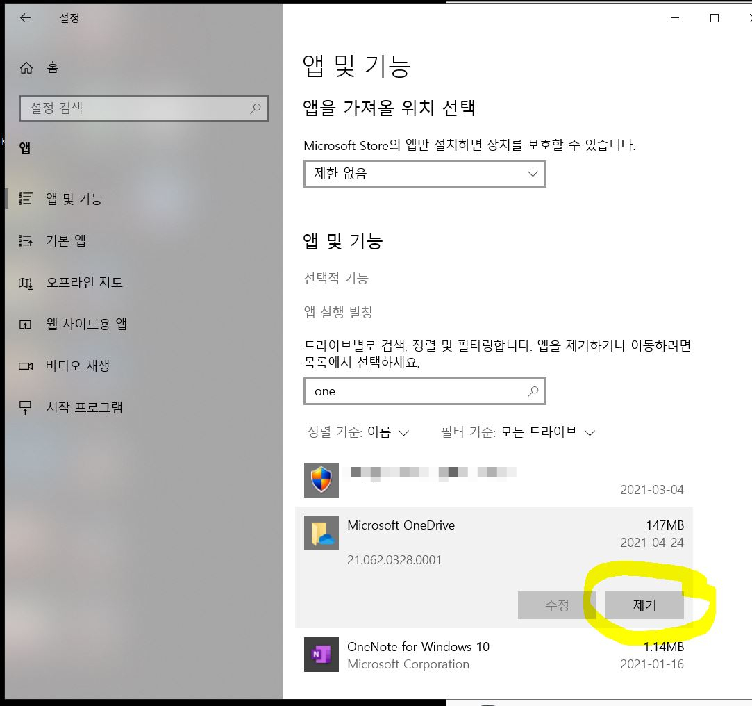 OneDrive삭제방법은 설정->앱들어가서