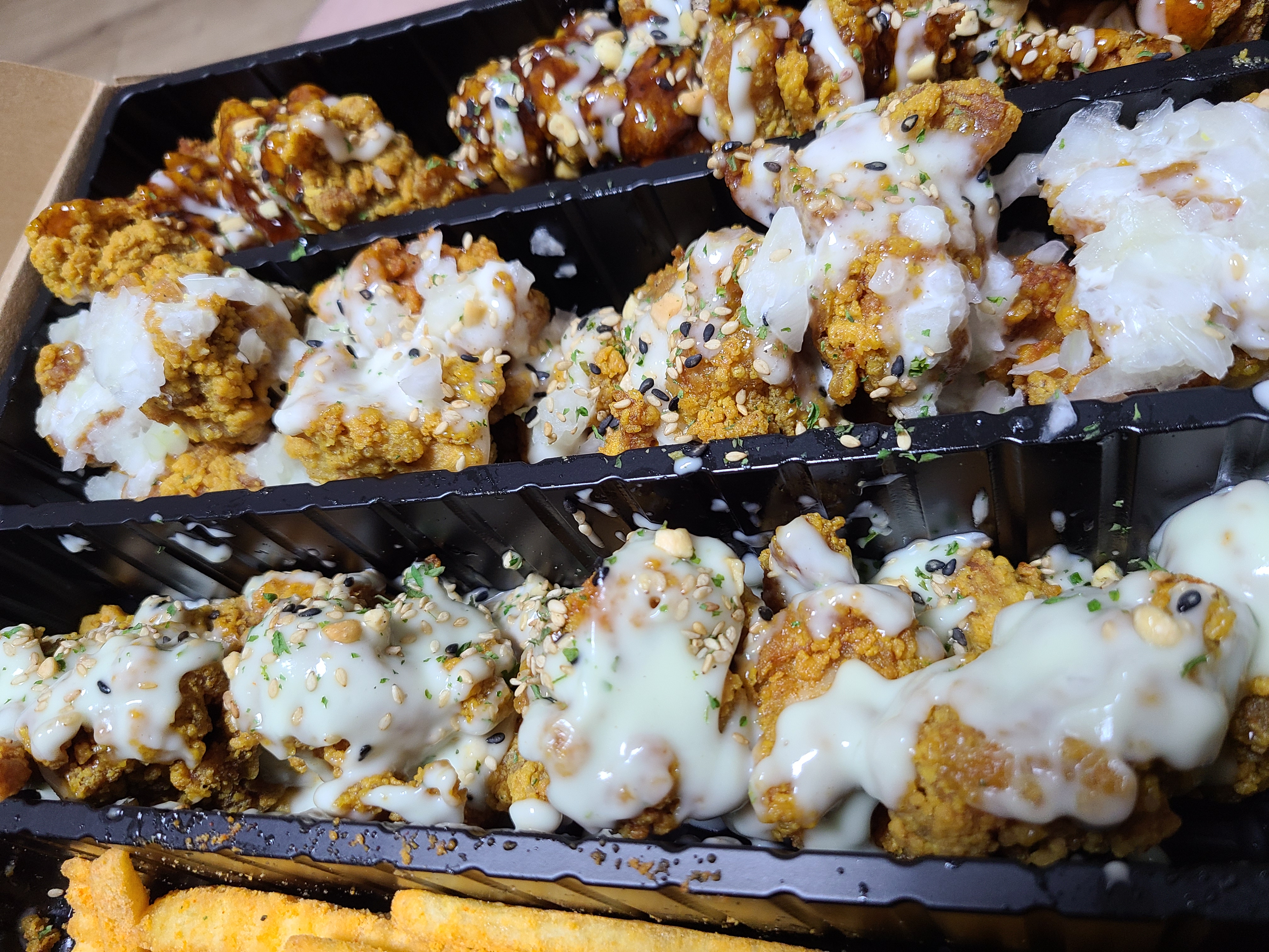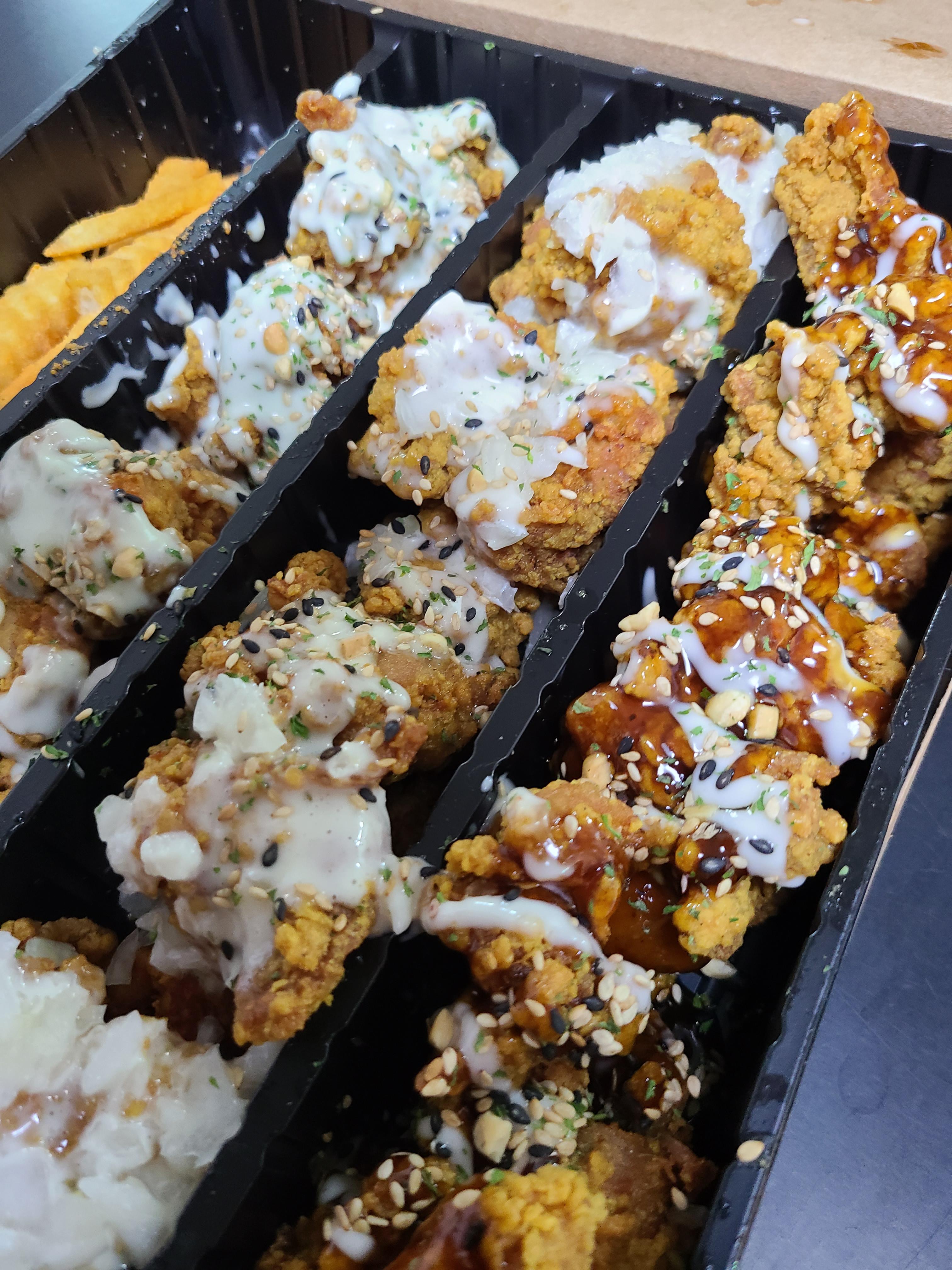 세가지맛의 소스가 뿌려진 치킨,