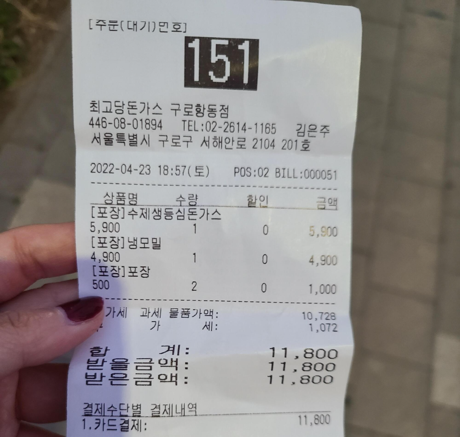근데 보통은 테이크아웃은 할인이 있거나 금액이 같은데 여기는 포장비가 500원 별도로 추가된다.