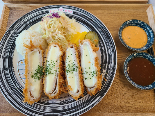치즈돈가스와 2가지 소스. 돈가스 소스와 살짝 매콤한 로제 소스.